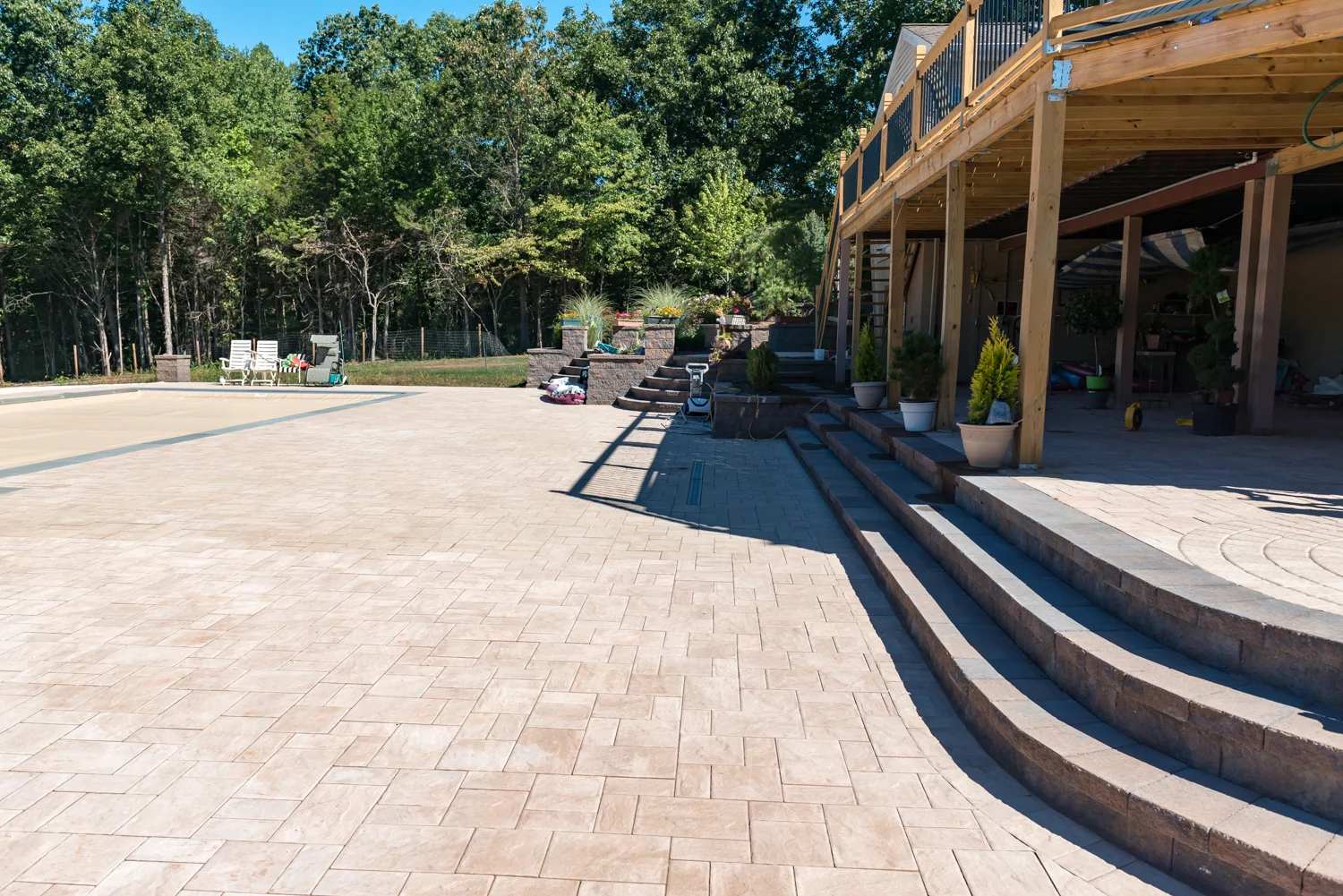 Beautiful pavement patio and stone work made this modern backyard simple, elegant, and reflected the vision of the property owners. It shows that K and C Land Design and Construction is capable of unique designs do not have the same look and functionality. The pool cover color also blends with the stone patio for consistent look and style. If you can envision it, we can make it come to life and we will guide your thinking along the way to ideas you may not have considered. Contact Us for an estimate on your backyard environment.