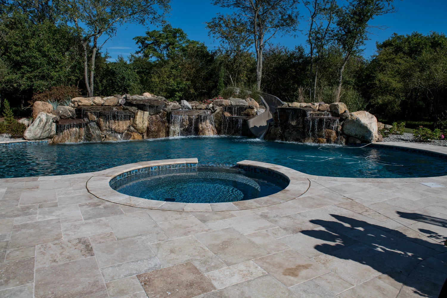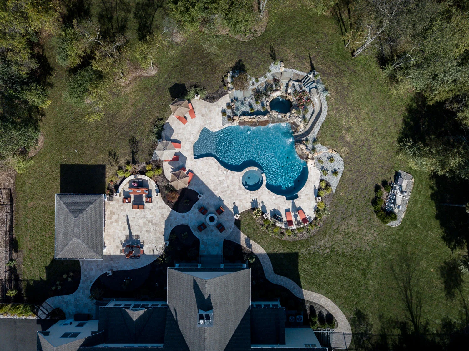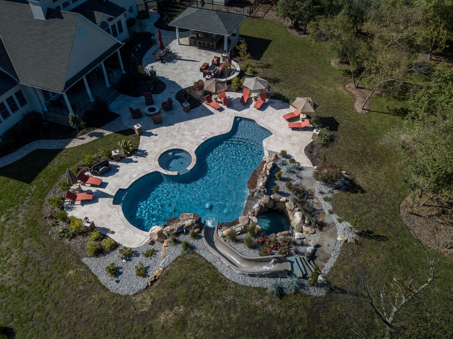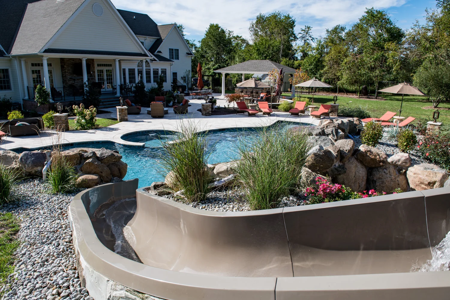 The full-backyard transformation! The especially uniquely shaped gunite inground pool Pennington NJ with water slide and waterfall was just the beginning of a resort-like environment. We added a large, round spa, fire-pit, plenty of lounge chair seating for entertaining, and two more seating/eating areas next to the covered out-door kitchen with wetbar and bar-stools. The landscaping design complements the stone and hardscaping and will fill out over time to add a more natural feeling to the environment. This backyard was designed to entertain adults and families for all three seasons. We are booking now for next year design and build inground pool and spa projects. Call or email us to start discussing your vision.