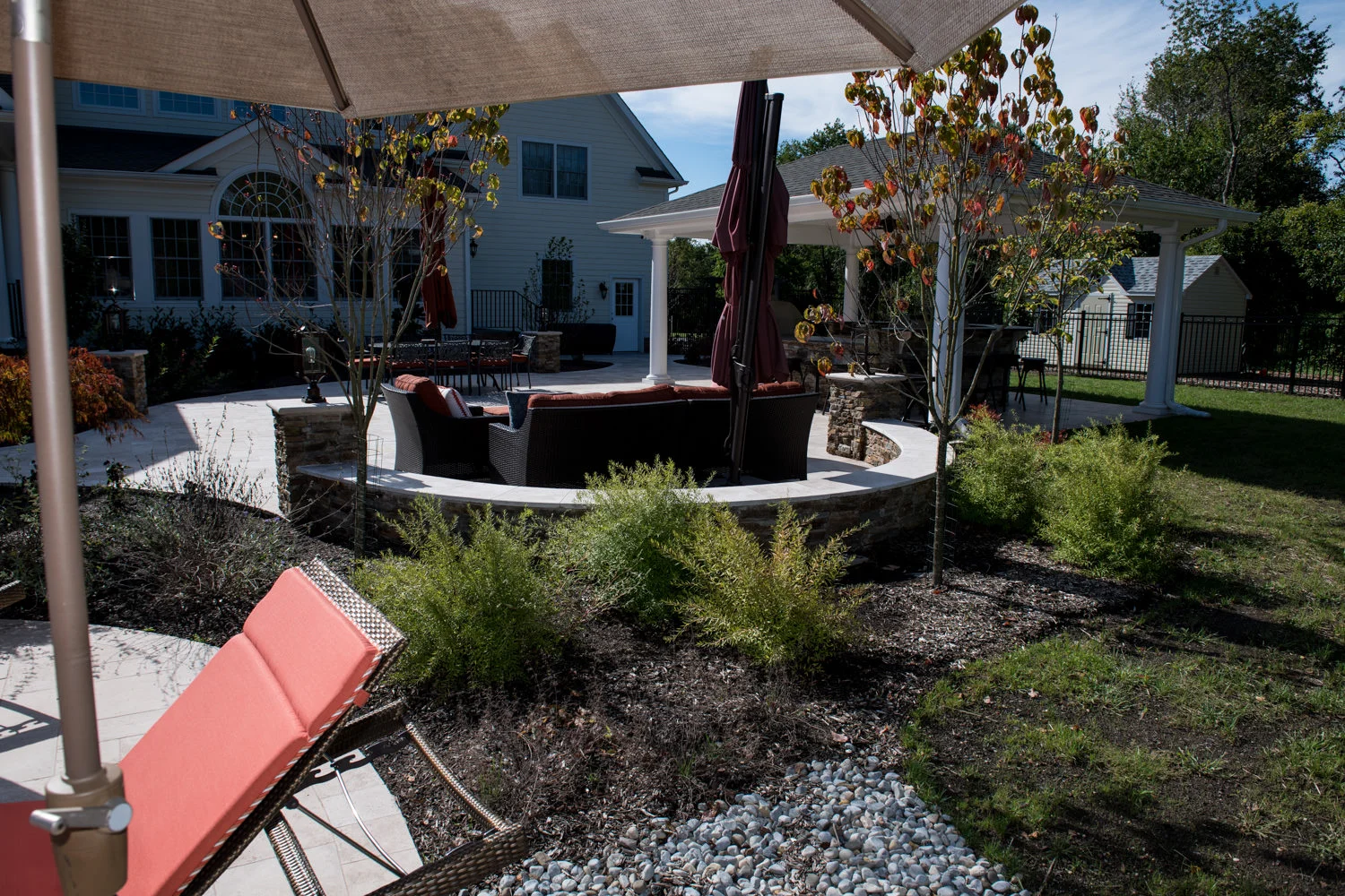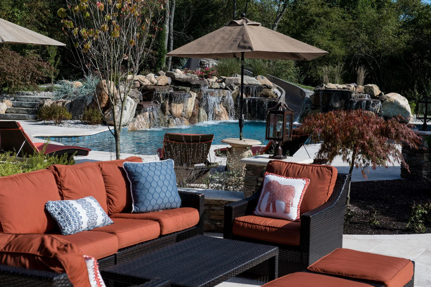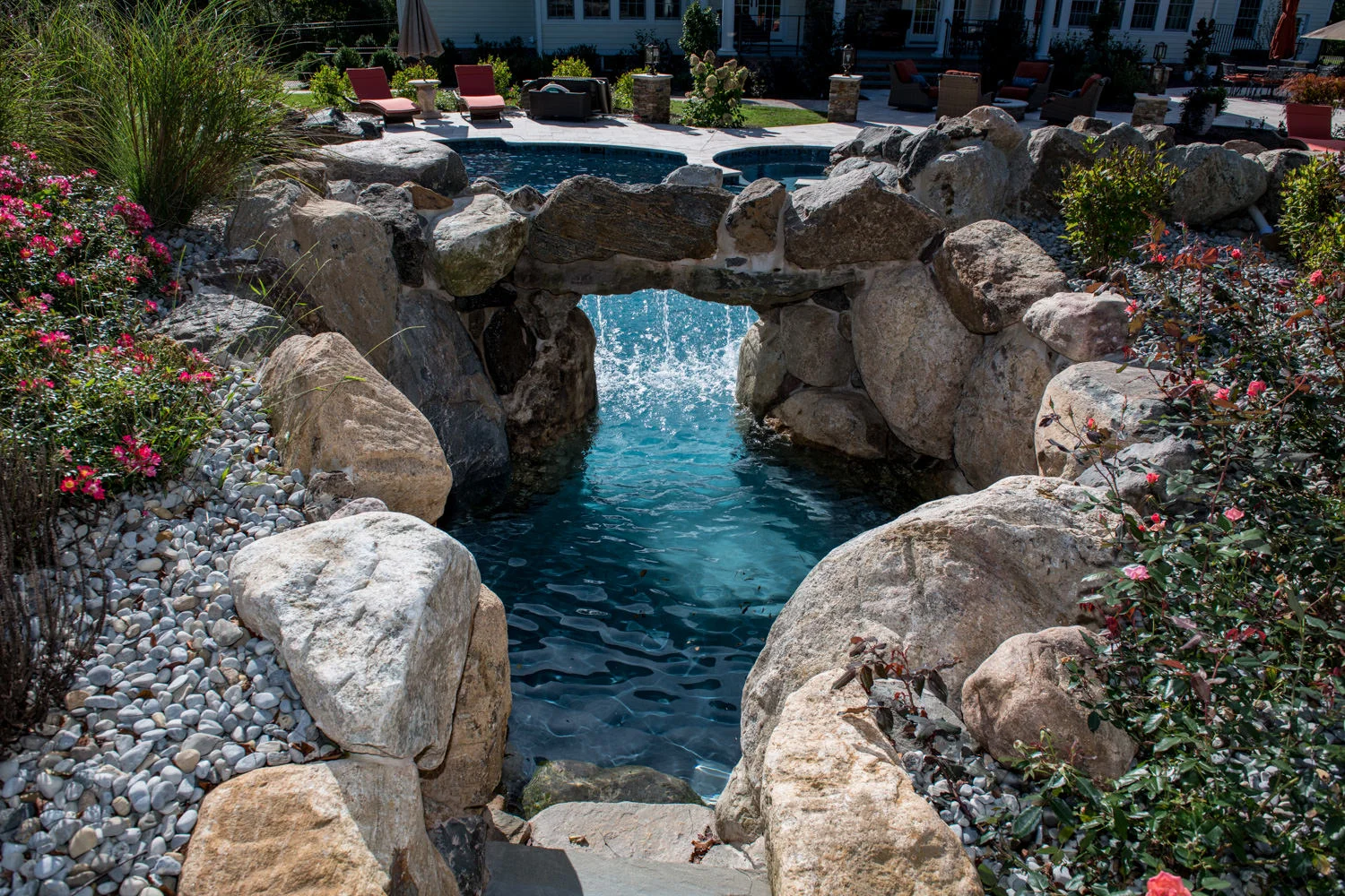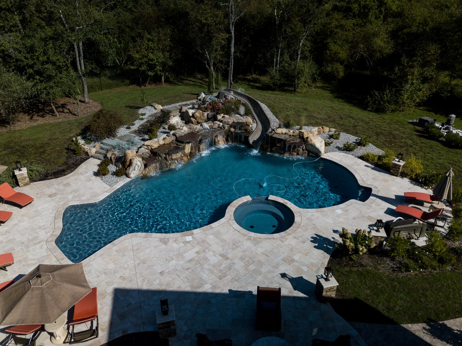The full-backyard transformation! The especially uniquely shaped gunite inground pool Pennington NJ with water slide and waterfall was just the beginning of a resort-like environment. We added a large, round spa, fire-pit, plenty of lounge chair seating for entertaining, and two more seating/eating areas next to the covered out-door kitchen with wetbar and bar-stools. The landscaping design complements the stone and hardscaping and will fill out over time to add a more natural feeling to the environment. This backyard was designed to entertain adults and families for all three seasons. We are booking now for next year design and build inground pool and spa projects. Call or email us to start discussing your vision.