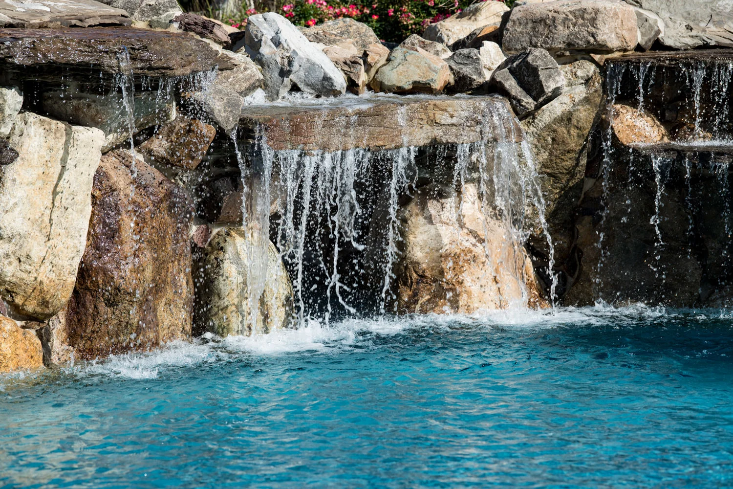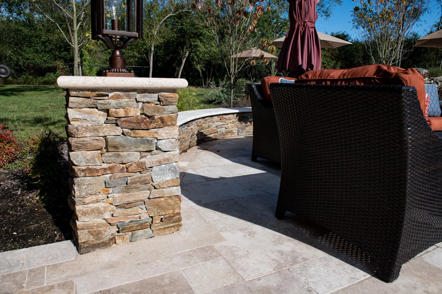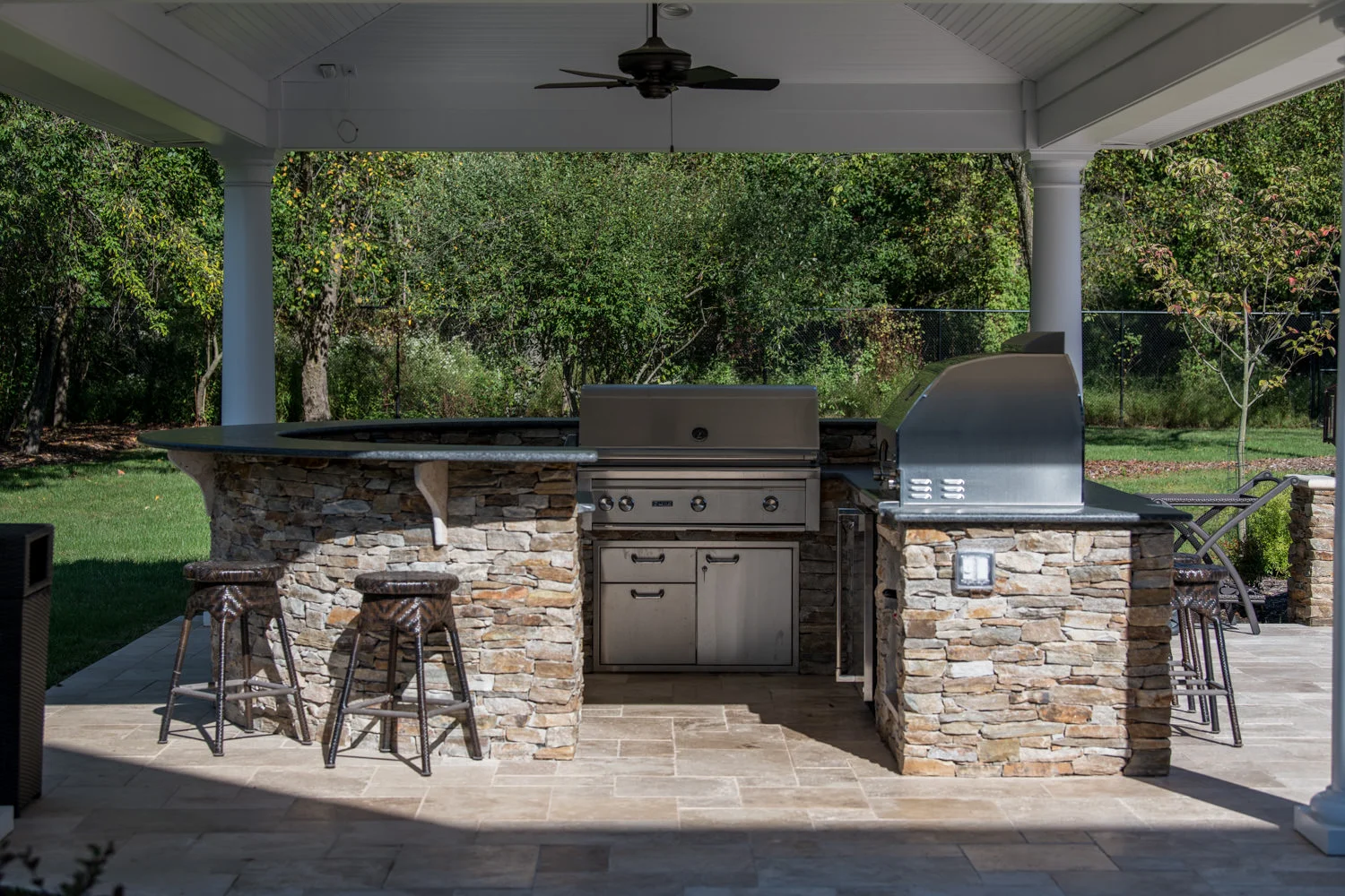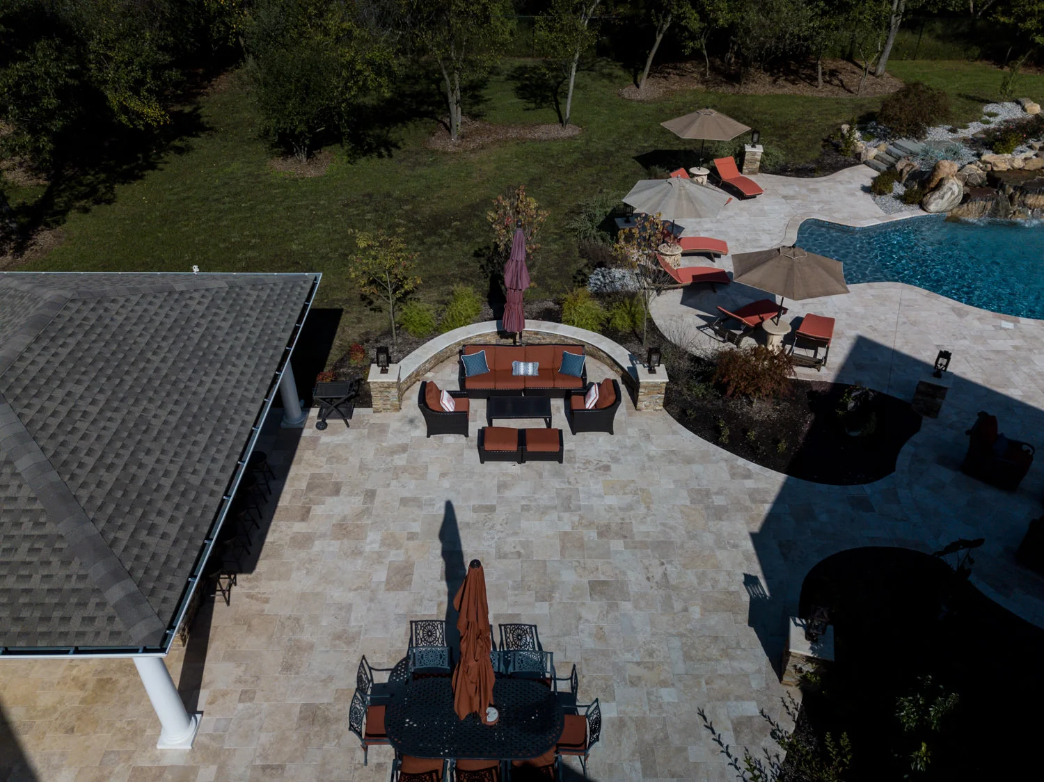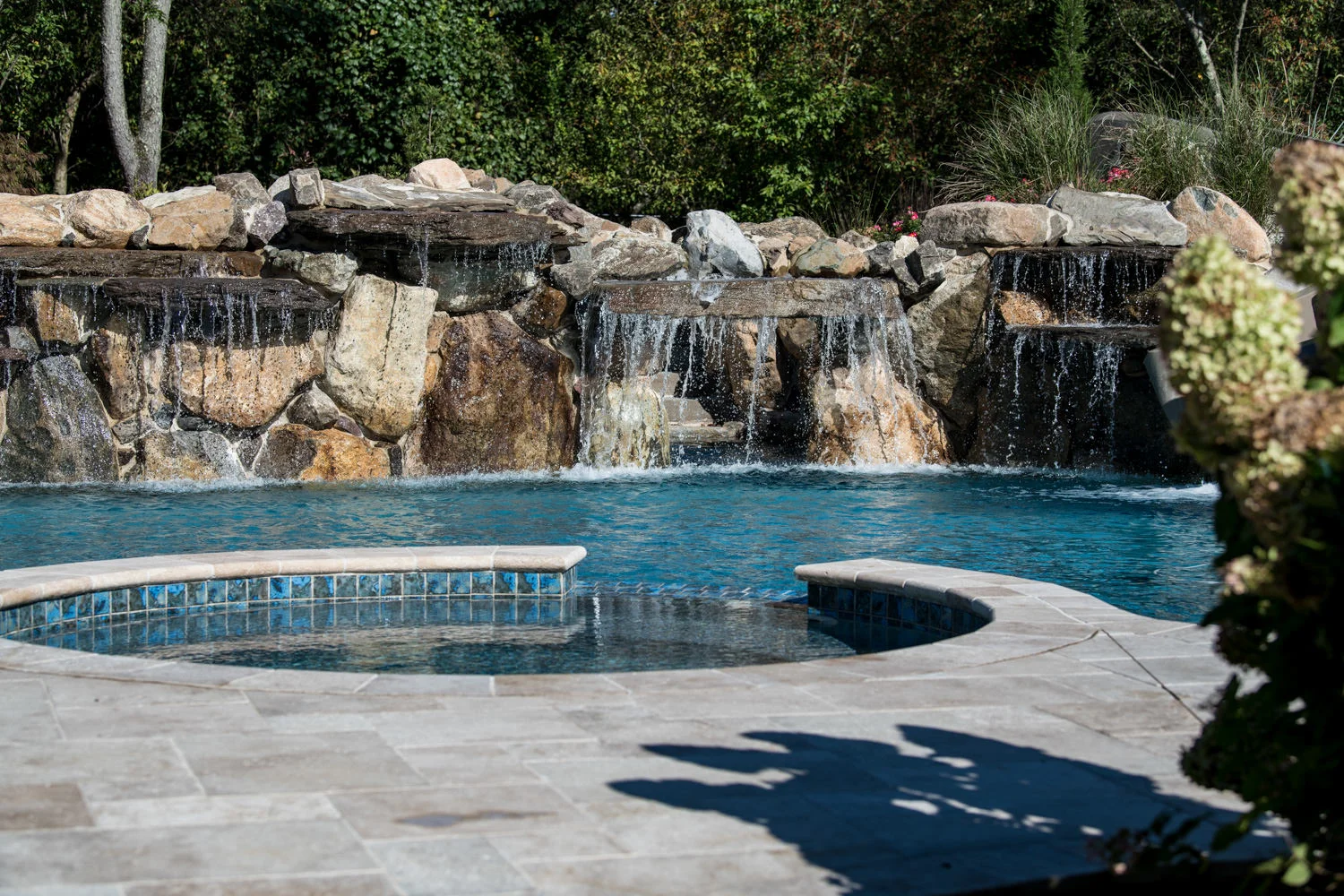 The full-backyard transformation! The especially uniquely shaped gunite inground pool Pennington NJ with water slide and waterfall was just the beginning of a resort-like environment. We added a large, round spa, fire-pit, plenty of lounge chair seating for entertaining, and two more seating/eating areas next to the covered out-door kitchen with wetbar and bar-stools. The landscaping design complements the stone and hardscaping and will fill out over time to add a more natural feeling to the environment. This backyard was designed to entertain adults and families for all three seasons. We are booking now for next year design and build inground pool and spa projects. Call or email us to start discussing your vision.
