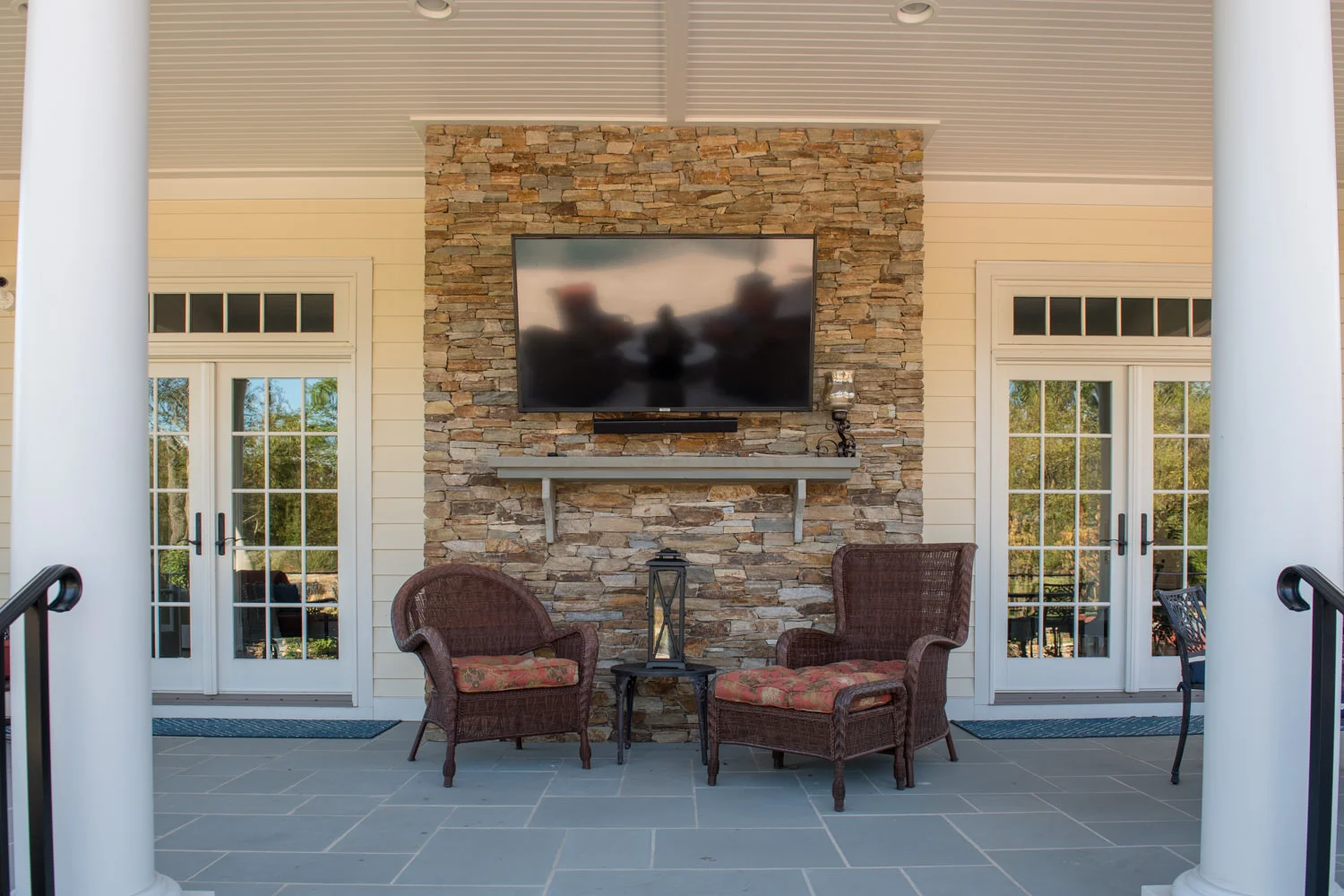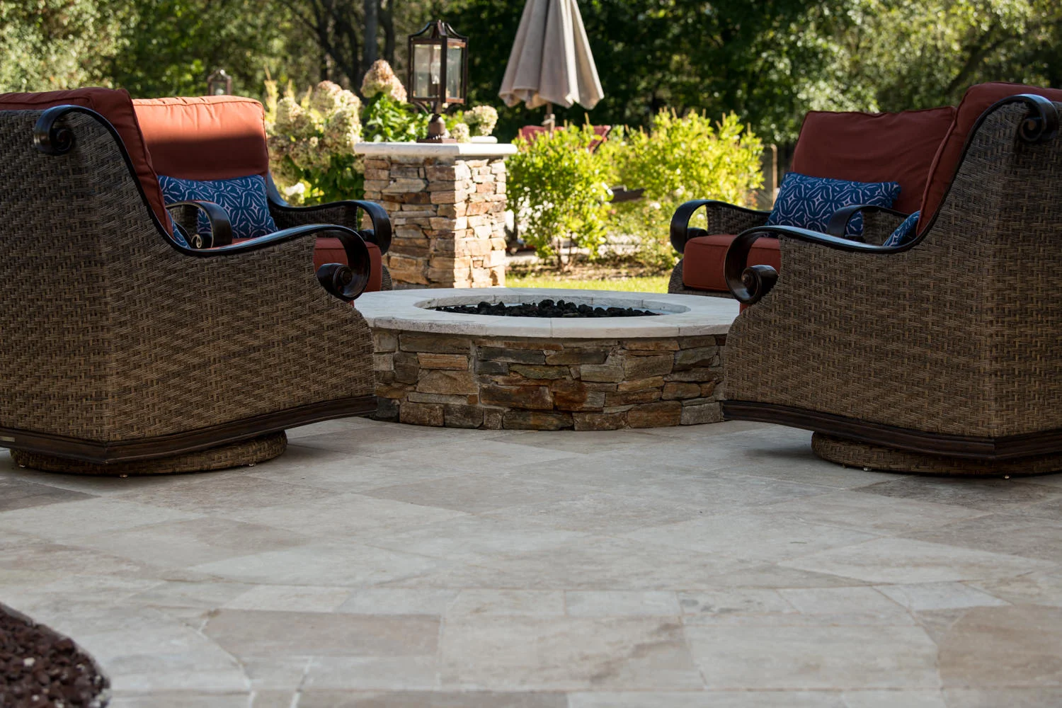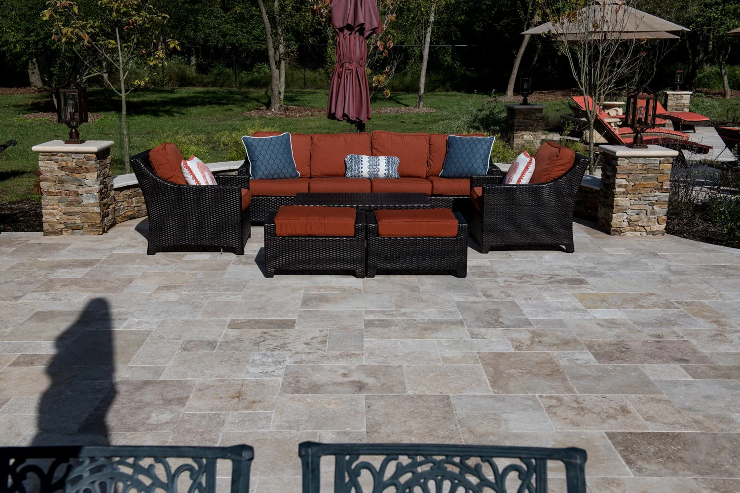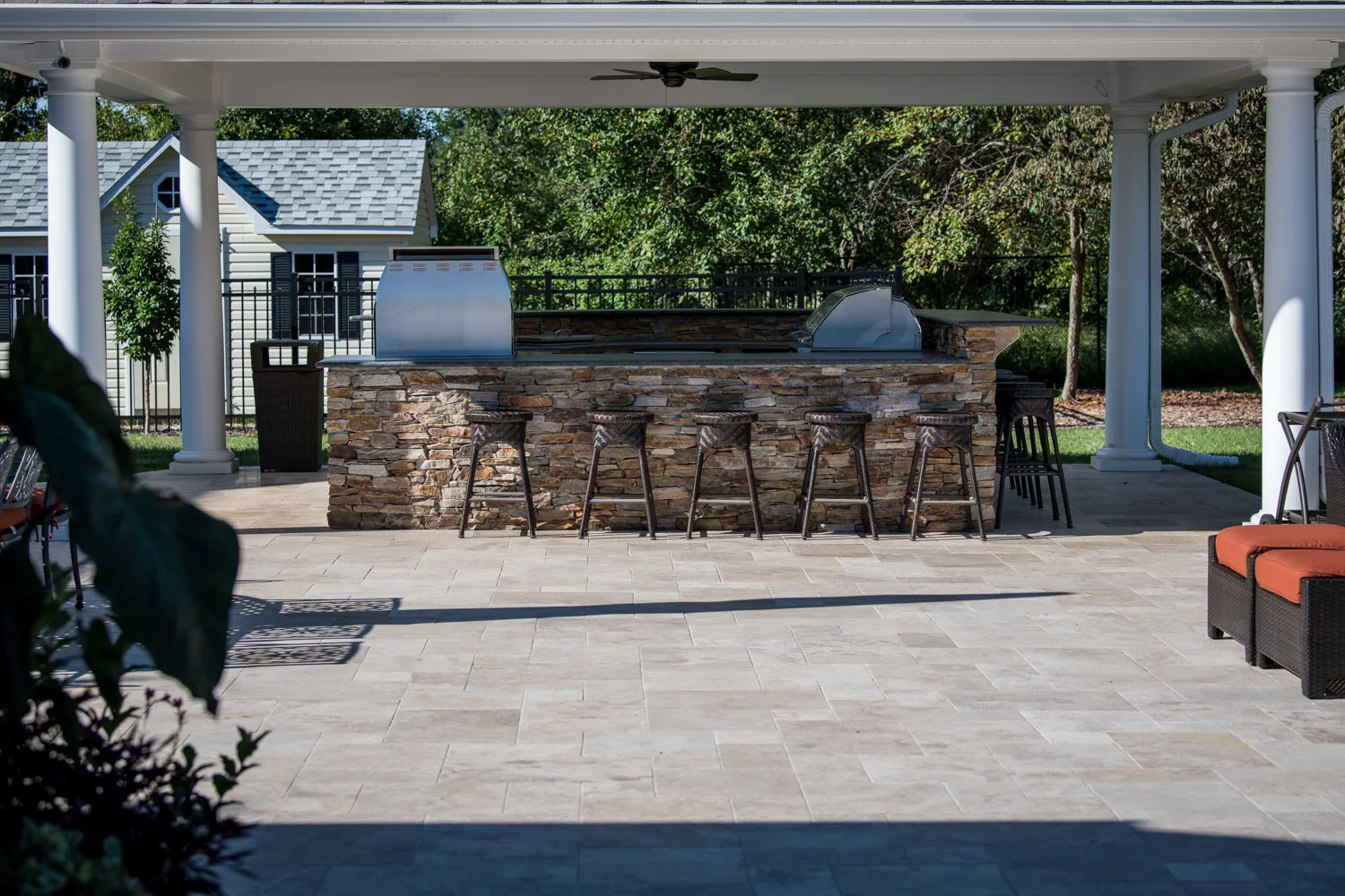 The full-backyard transformation! The especially uniquely shaped gunite inground pool Pennington NJ with water slide and waterfall was just the beginning of a resort-like environment. We added a large, round spa, fire-pit, plenty of lounge chair seating for entertaining, and two more seating/eating areas next to the covered out-door kitchen with wetbar and bar-stools. The landscaping design complements the stone and hardscaping and will fill out over time to add a more natural feeling to the environment. This backyard was designed to entertain adults and families for all three seasons. We are booking now for next year design and build inground pool and spa projects. Call or email us to start discussing your vision.
